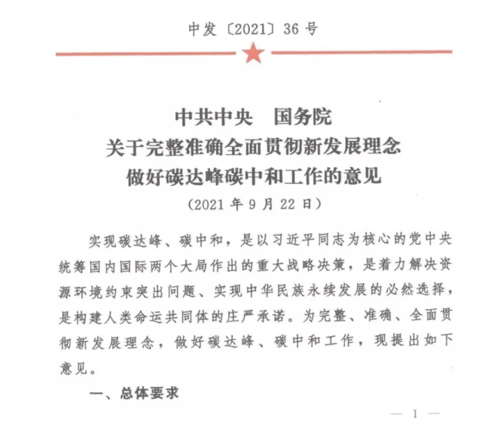 9月22日,中共中央下發(fā)《關(guān)于完整準(zhǔn)確全面貫徹新發(fā)展理念做好碳達(dá)峰碳中和工作的意見(jiàn)》。