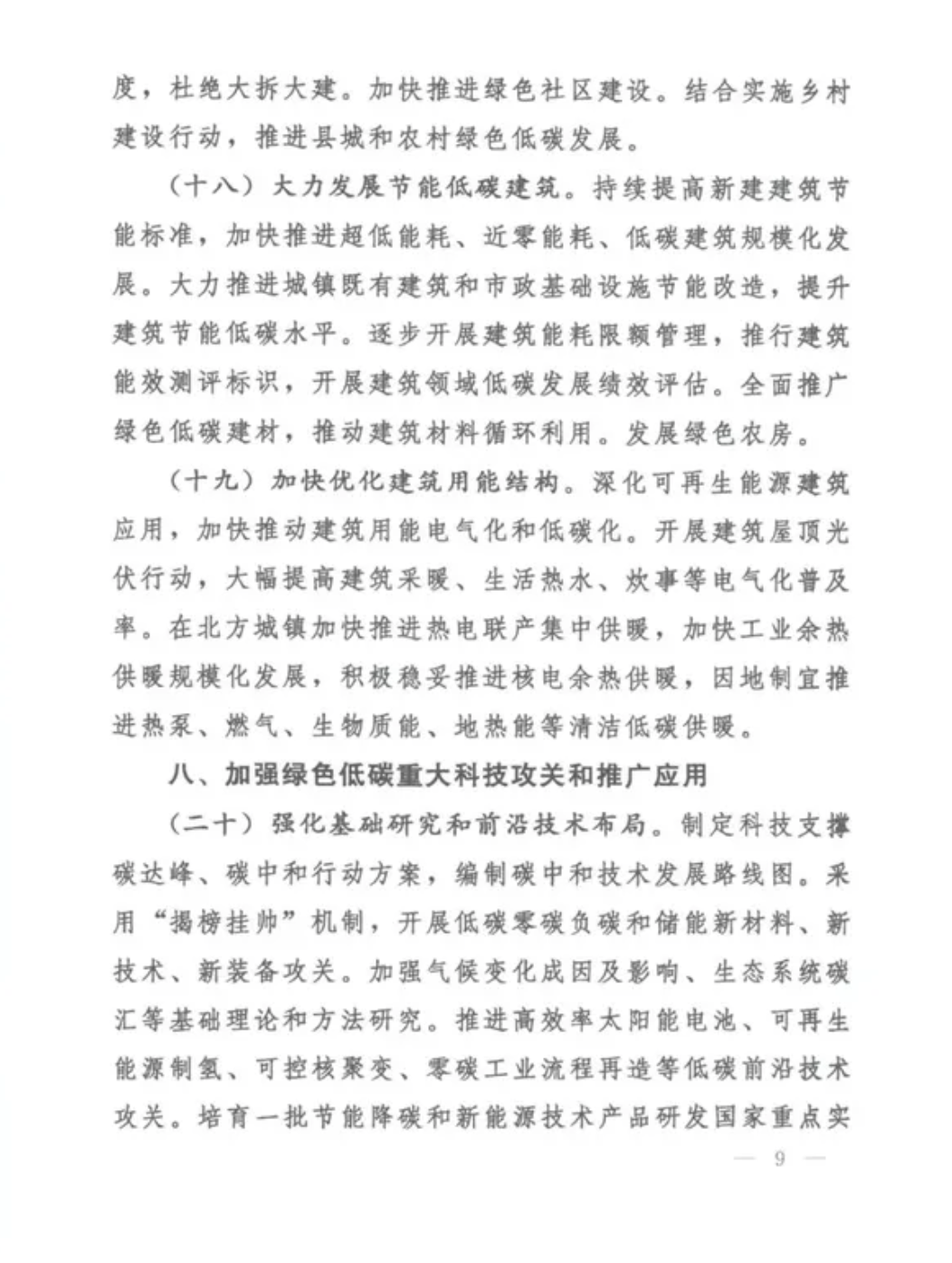 (十八)大力發(fā)展節(jié)能低碳建筑。持續(xù)提高新建建筑節(jié)能標(biāo)準(zhǔn),加快推進(jìn)超低能耗、近零能耗、低碳建筑規(guī)?;l(fā)展。大力推進(jìn)城鎮(zhèn)既有建筑和市政基礎(chǔ)設(shè)施節(jié)能改造,提升建筑節(jié)能低碳水平。逐步開(kāi)展建筑能耗限額管理,推行建筑能效測(cè)評(píng)標(biāo)識(shí),開(kāi)展建筑領(lǐng)域低碳發(fā)展績(jī)效評(píng)估。全面推廣綠色低碳建材,推動(dòng)建筑材料循環(huán)利用。發(fā)展綠色農(nóng)房。