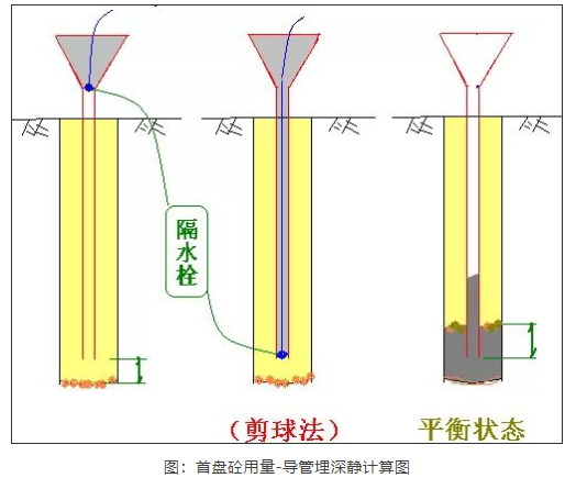 澆筑時(shí),先將導(dǎo)管內(nèi)及漏斗灌滿(mǎn)混凝土,其量保證導(dǎo)管下端一次埋入混凝土面以下1.0m以上,然后剪斷(或迅速拔出)懸吊隔水栓的鋼絲,混凝土拌和物在自重作用下迅速排出球塞進(jìn)入水中。