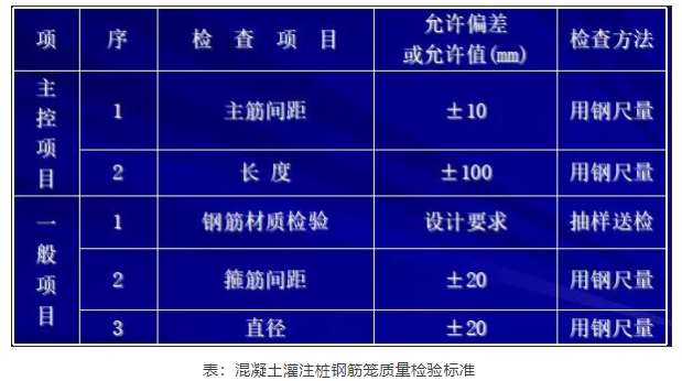 鋼筋籠主筋的保護(hù)層允許偏差:水下灌注混凝土樁為±20mm;非水下灌注混凝土樁為±10mm。